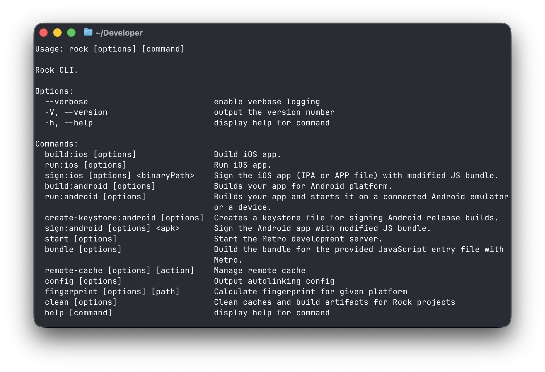 rock fingerprint OptionsThe fingerprint command calculates a unique hash that represents your project's native state. This hash is used for build caching and remains stable across builds unless you modify native files, change dependencies with native code, or update scripts in package.json.